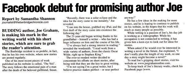 Joe Graham featured in this weeks issue of The Banbridge Chronicle, discussing his writing. The article was write by