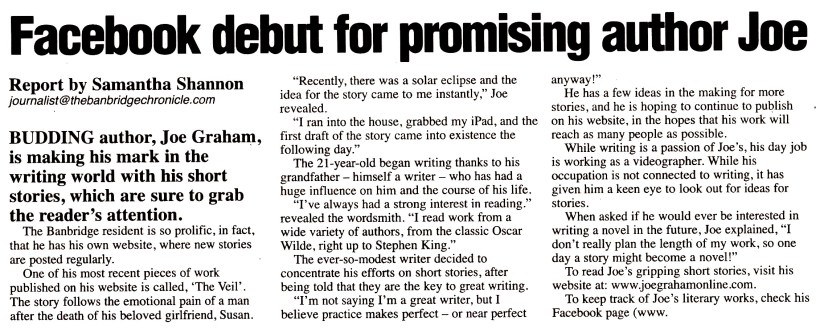Joe Graham featured in this weeks issue of The Banbridge Chronicle, discussing his writing. The article was write by Samantha Shannon.